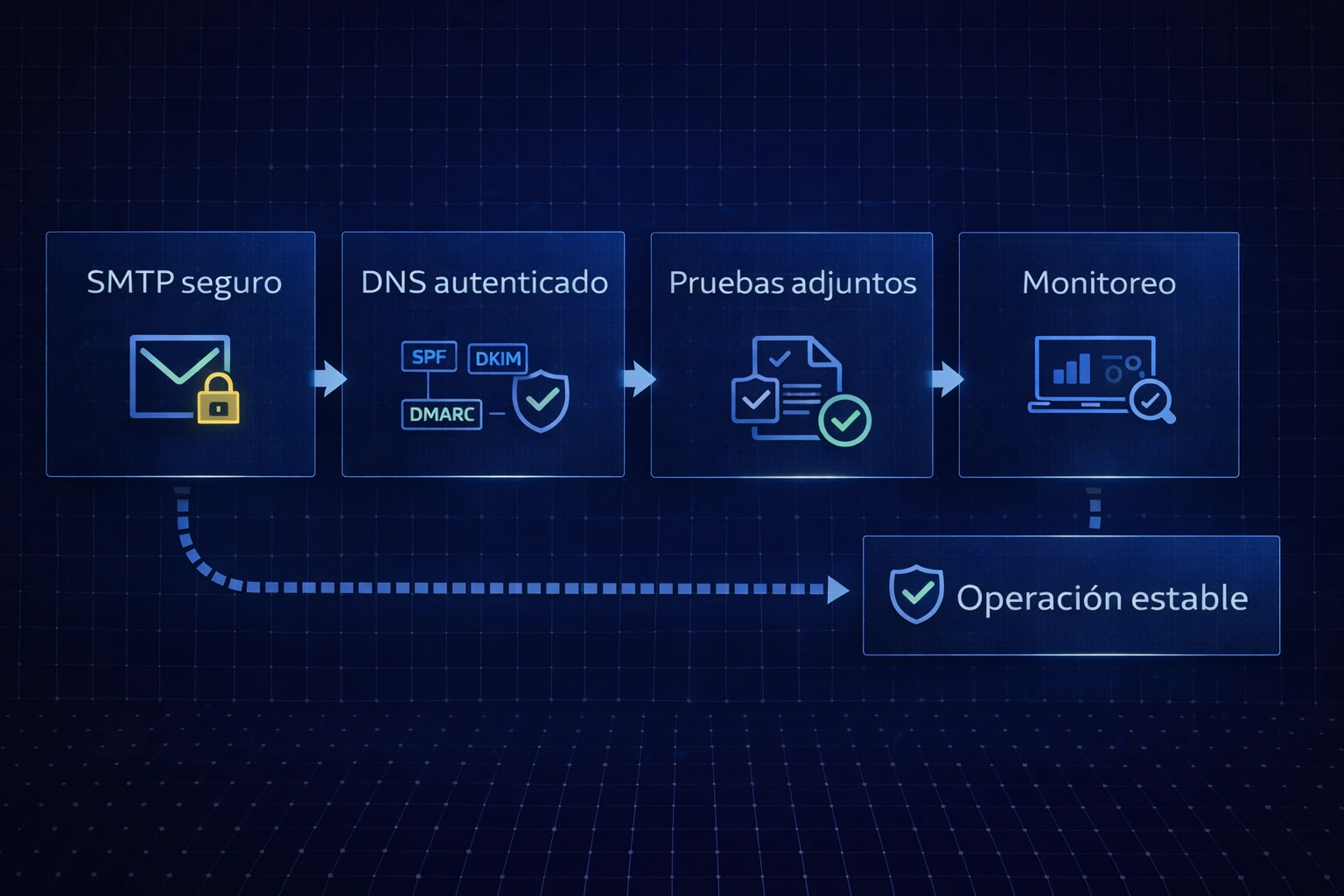 Que el sistema pueda enviar por SMTP con TLS, que el dominio esté autenticado con SPF/DKIM/DMARC y que exista evidencia (headers/logs) para diagnosticar.