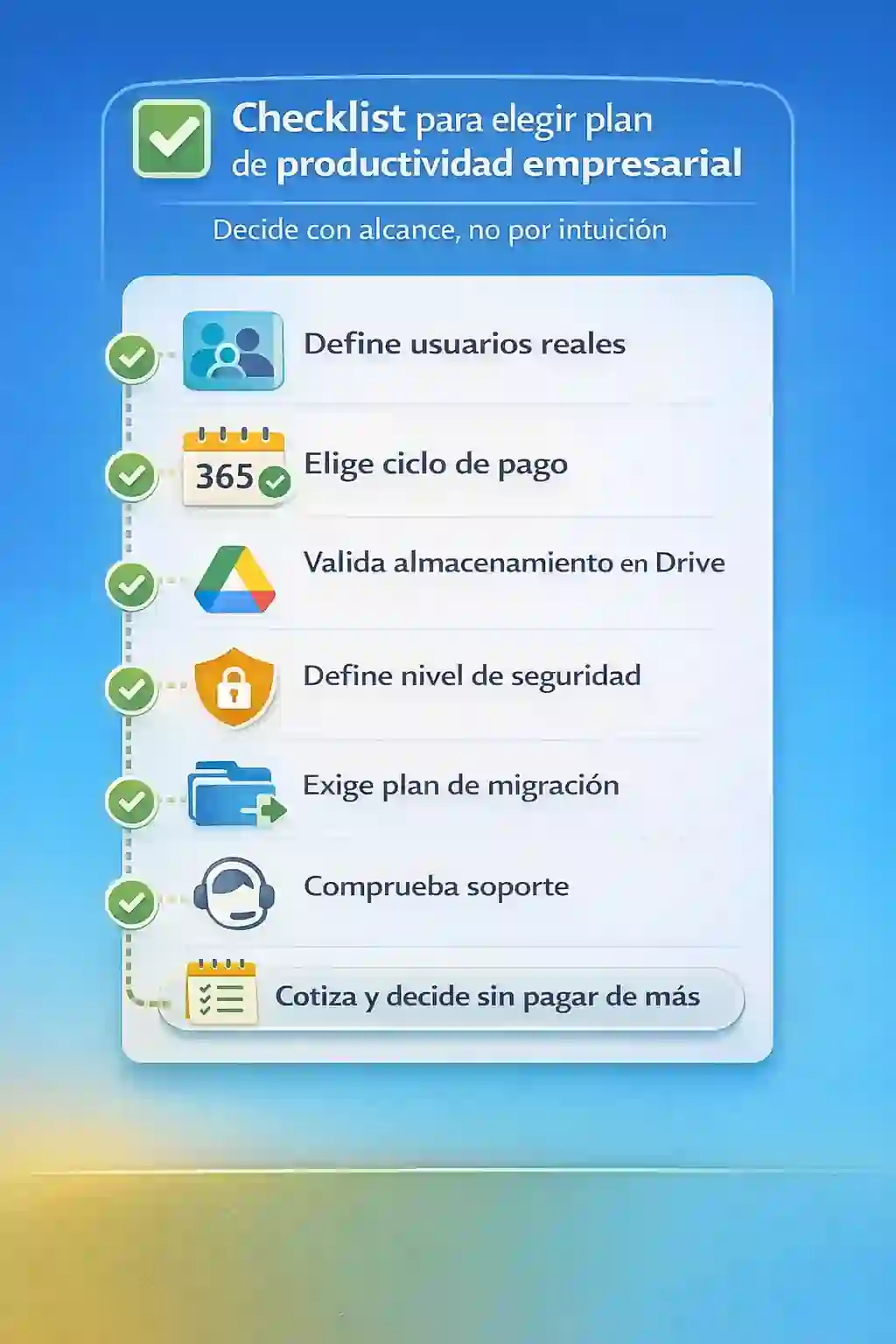 En este punto, si tu objetivo es elegir con claridad, vuelve a lo esencial: el mejor plan es el que sostiene tu operación sin fricción. Y, si estás comparando precios de Google Workspace en México, asegúrate de comparar también almacenamiento, seguridad, administración y soporte, porque ahí es donde se gana o se pierde el valor.