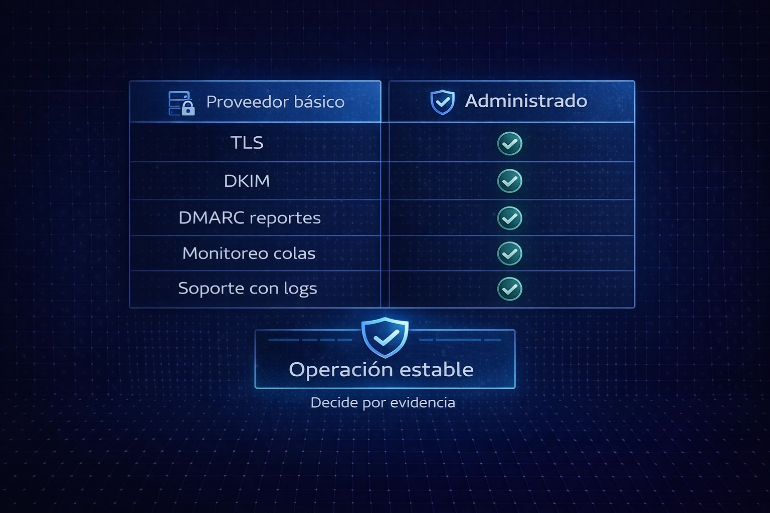 Entregabilidad y diagnóstico con evidencia. Es decir, SPF/DKIM/DMARC alineados, SMTP con TLS, y soporte que trabaje con headers y logs.